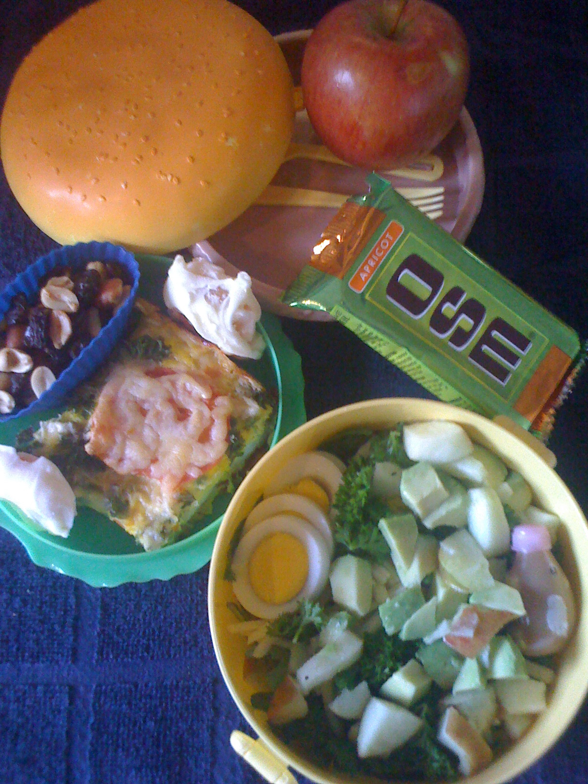 Top layer has the frittata from yesterday, nuts and raisins, and some yogurt covered dried apricots. One square meal bar and an apple on the side.
