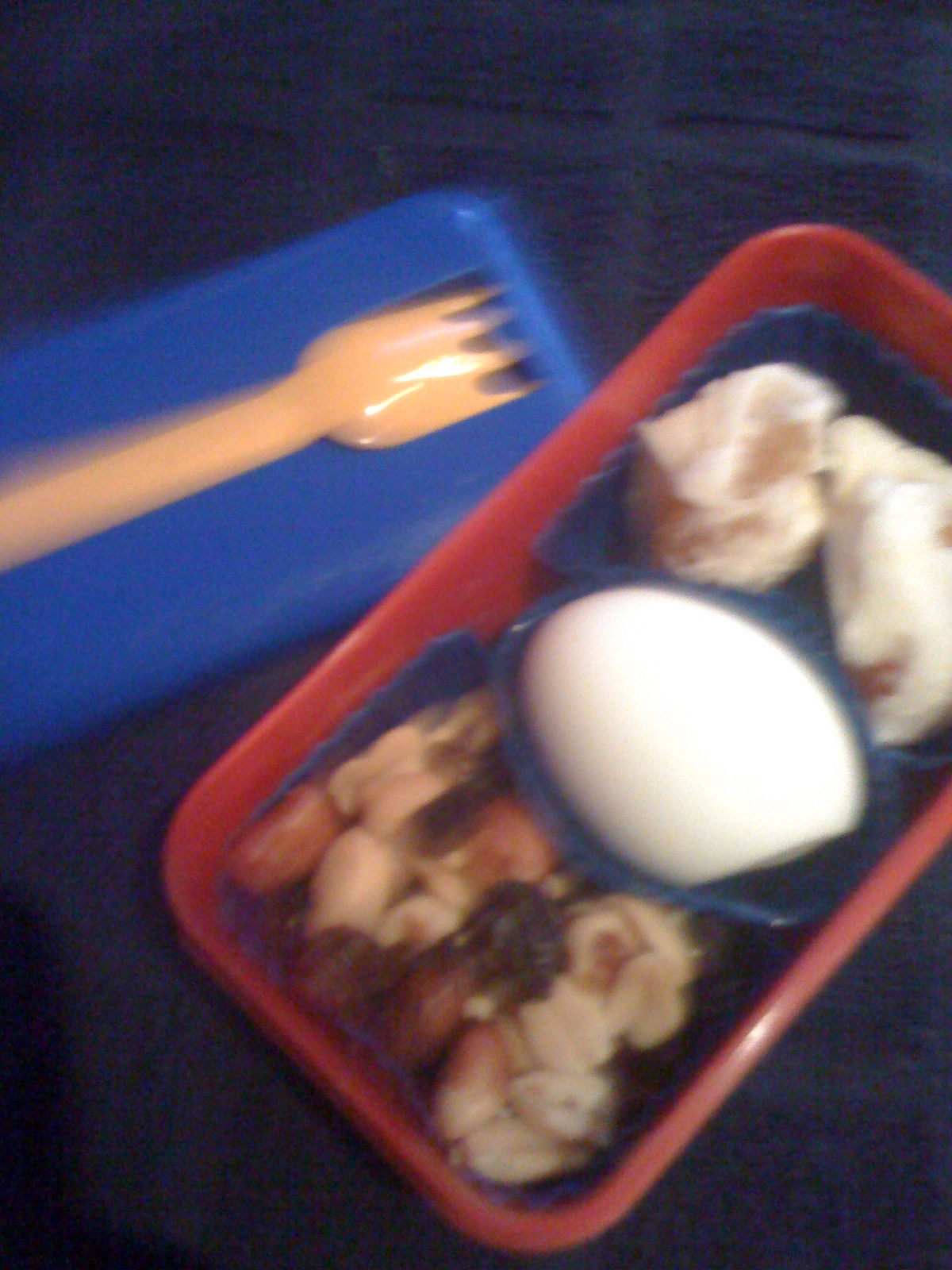 A rushed snack, and a rushed photo sorry…. but here it is…. a selection of nuts and raisins, a boiled bantum egg for protein and 2 yogurt covered apricots.