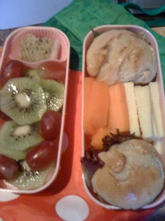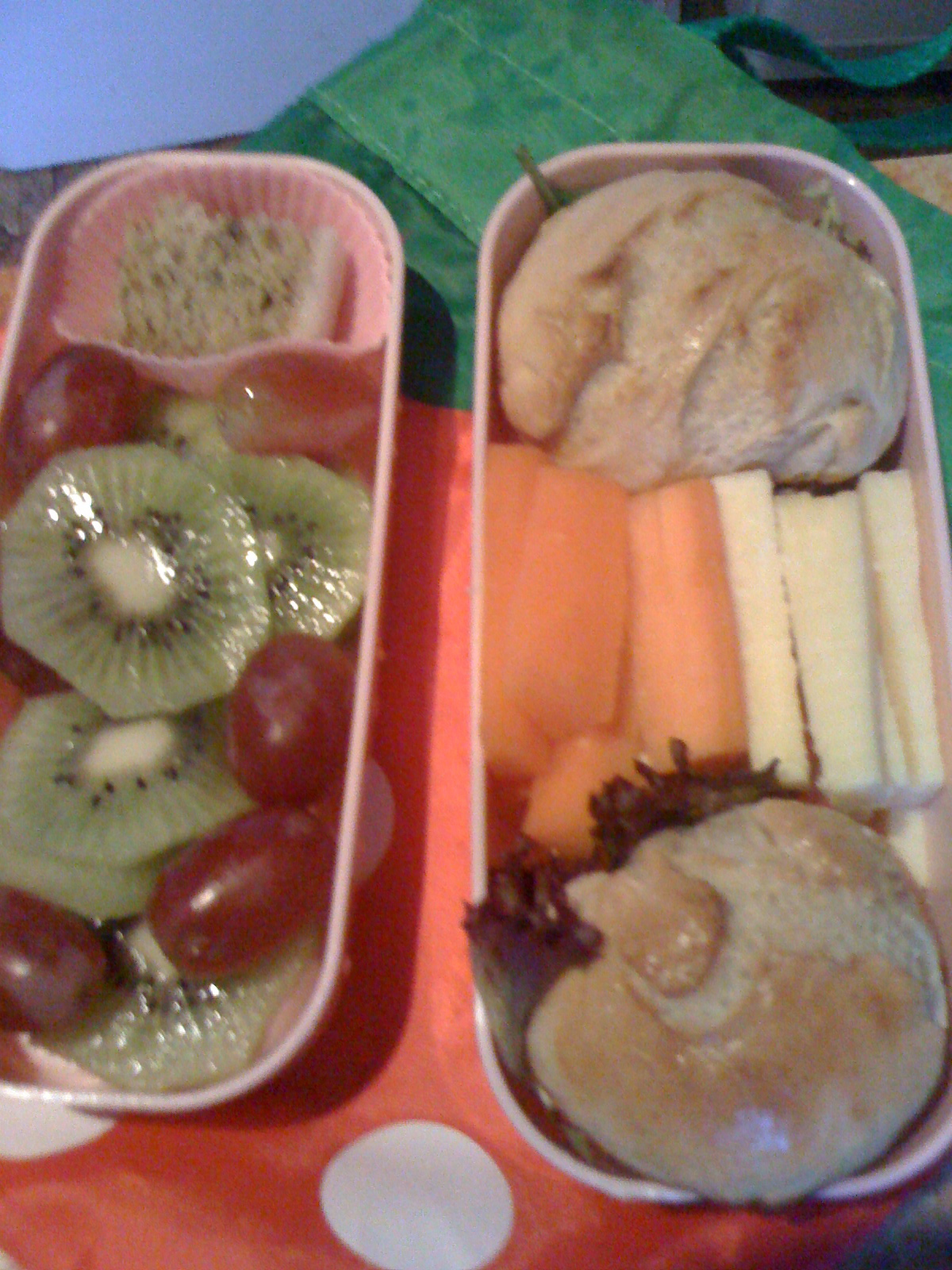 The bottom layer as kiwifruit slices, seedless grapes and a piece of banana cake. The top layer has cheese and carrot sticks with 2 mini bagels- both with avocado, lettuce, tomato and mayonaise. All eaten during dress rehearsal. Yay.