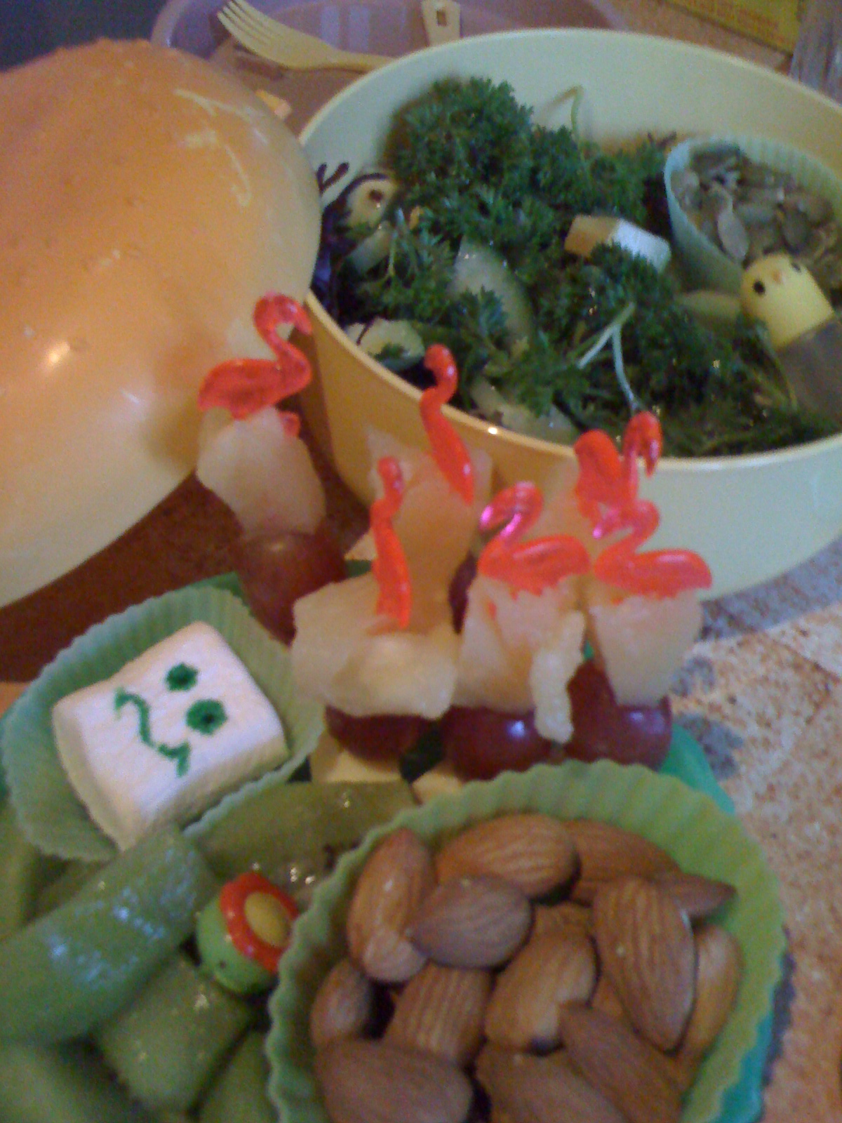 It’s the hamburger bento again…. salad on the bottom layer. Boring as. Top layer has flamingo sticks of cheese, pineapple and grapes (my salute to Grandma’s luncheons)…. kiwi fruit slices, a thingy of almonds and a marshmellow with apprehensive face drawn on. All the picks are birds, and the salad dressing is in a bird bottle—- my salute to flapping! It had me smiling anyway.