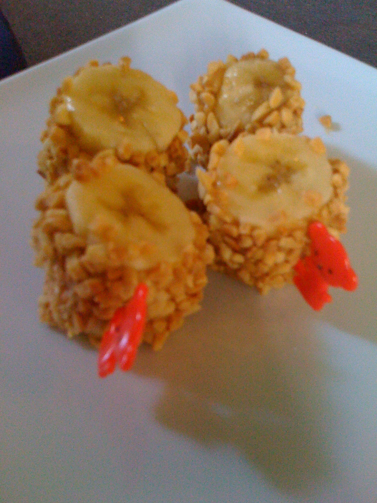 First I made “Banana Tree Stumps”…. these are basically peanut butter and honey around a piece of banana, then rolled in chopped nuts. They were totally tastey… but… there was not a lot of guidance about HOW to do this. I discovered that those corn-handles worked well, and a light covering of the peanut buttery stuff was the least messy method…. and then sprinkling the nuts on top. I think if I was going to put them in a bento, I would make them and freeze them overnight before taking to work. Interestingly, banana slices out of the skin stay yellow in the freezer.