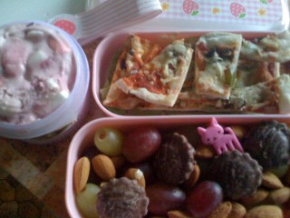 Here in my gorgeous wee pink strawberry bento we have…. pizza bites on a bed of lettuce (vegetarian), an assortment of grapes, almonds and mini-toffee pops for snacking on during lunchtime tutorial sessions… and some ambrosia on the side. All pretty in pink.