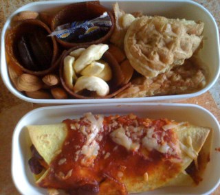 The bottom layer has 2 enchilada’s (second added after photo was taken) with refried beans, carrots, and onions.
