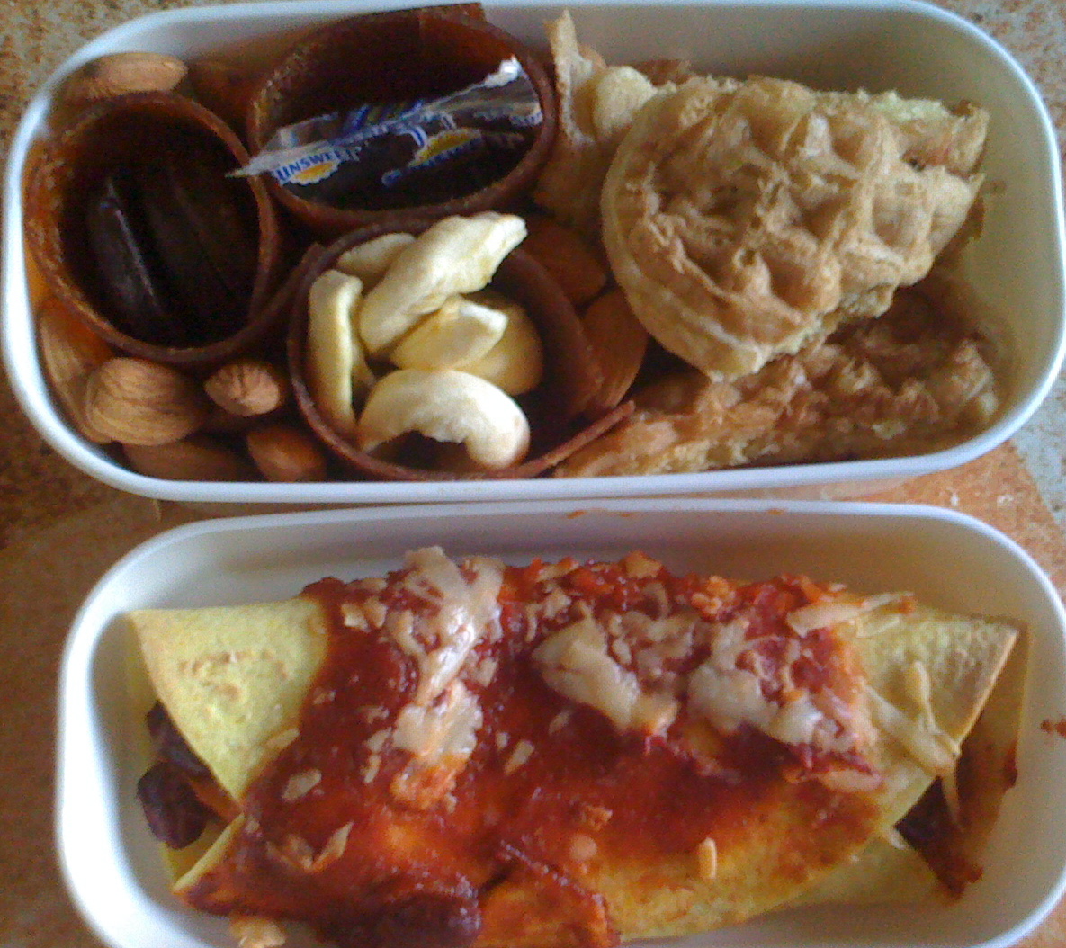 The bottom layer has 2 enchilada’s (second added after photo was taken) with refried beans, carrots, and onions.