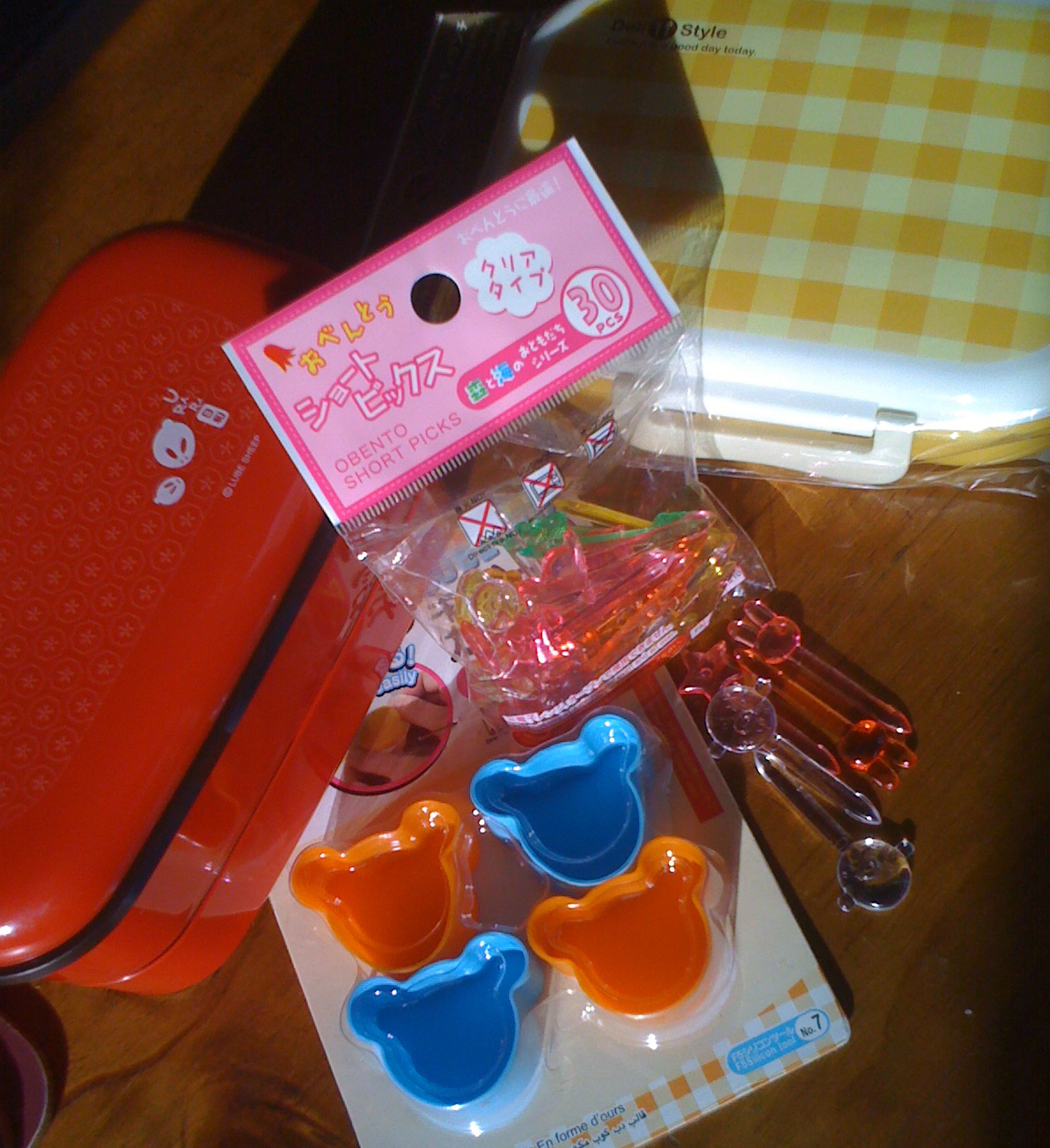I managed to get a red 2 tier bento, a one layer yellow bento to match a 2 tier one I have, 4 bear silicon cups, and a set of picks.