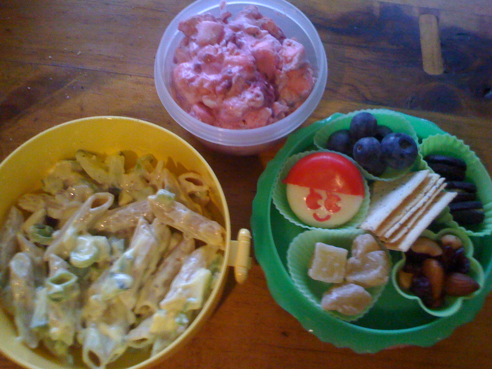 Basically we have a simple egg and pasta salad, whipped up with garden greens, a pottle of ‘travel ambrosia’ (those long-time followers will be well aware of my desire for the perfect ambrosia for lunch). The top layer of the hamburger bento has a baby-bel cheese round, with a face! I got the punch to work! I was totally stoked with that. There is also a thingy of ginger, mixed nuts with cranberries, fresh blueberries, mini toffee-pop biscuits and some cracked pepper crackers.