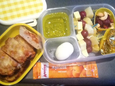 In the Easy Lunchbox there is lemon jelly – set into the container (a remnant of the husbands instruction to only eat clear foods prior to his Drs appointment), a hard boiled egg sliced into segments, cheese grape and pineapple skewers, mixed nuts with goji and cranberries and a couple of after dinner mints… yum!