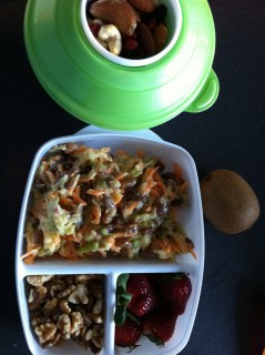 In the green container we have more of the lentil salad, the large square box has strawberries and an apple and carrot salad, with walnuts ready to add.