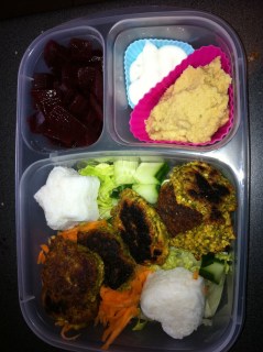The Iskender revisited. We now all know I LOVE LEFTOVERS and this is why…. Yummo. The dark section is beetroot, yogurt and hummus in the other side, lettuce, carrot and cucumber with felafel patties and rice things… done in one of those rice shapers…. a heart and a star. Too cute to eat really. But I ate it all….. for morning tea!