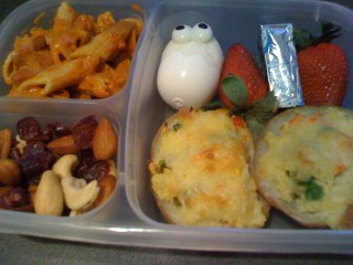 In the main section, boiled egg, strawberries, cheese slice and a couple of baked stuffed potatoes.