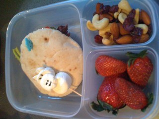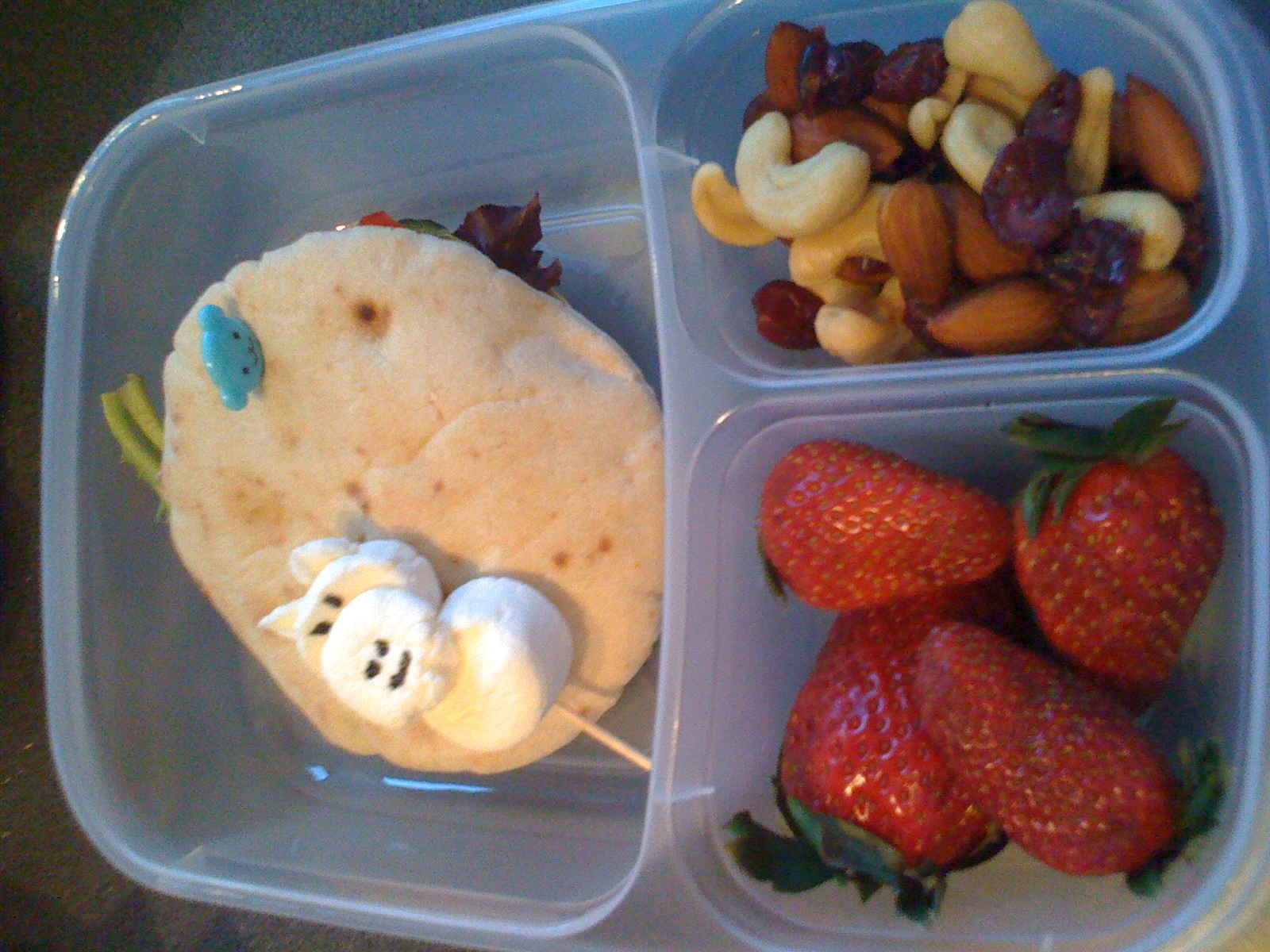 The main is a pita sandwich with salad, and the staple strawberries and nuts.
