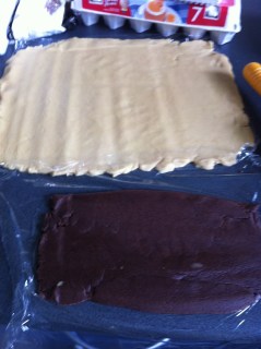 Do the same with the dark section. I found this one much harder to roll, because it was less moist, given the added cocoa powder.