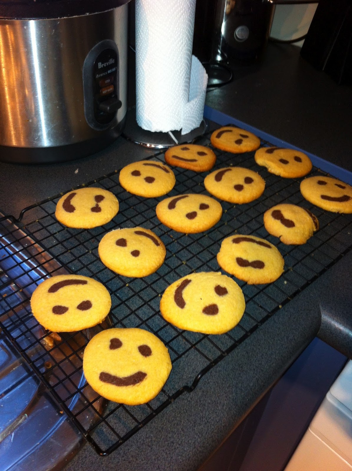 The gears went whirring, and this is what we came up with- Happy Face Biscuits. They were made from a basic refrigerator biscuit dough, with some split off and coloured with cocoa powder.