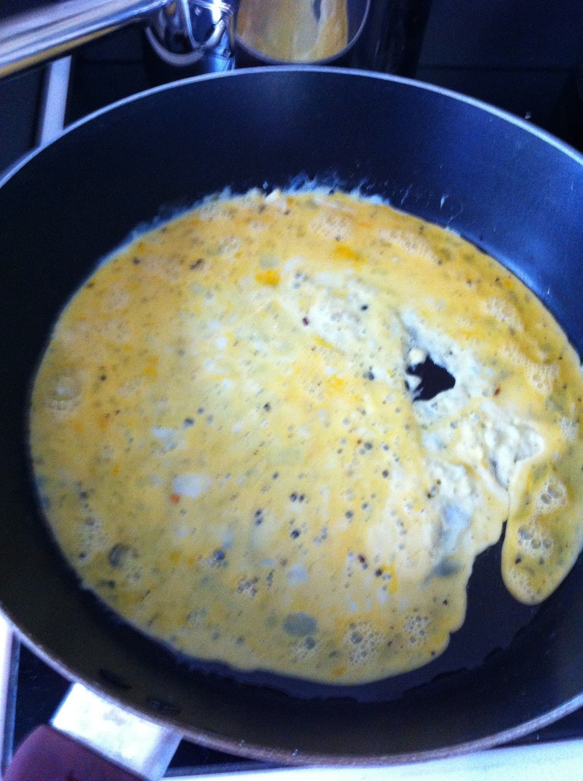 2. Whisk the 2 eggs in a bowl with a splash of milk. Add chili, salt and pepper. Throw a little olive oil in a hot frying pan, then add the egg. Cover the base of the frying pan, and let the uncooked egg under the edges of the cooked egg…. like making an omelet.