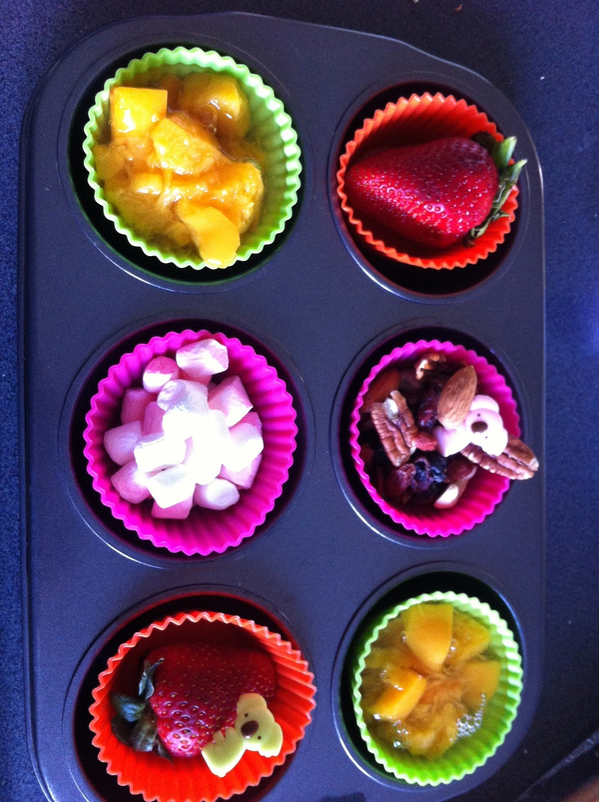 Diced peaches in juice, strawberries, mixed nuts with cranberries and baby-mellows. And a couple of random koalas for good measure.