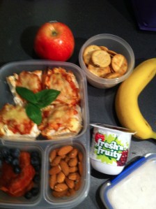 Here we have baked-bean mousetraps, with dried peaches and blueberries, and almonds… with yogurt, crackers and onion dip, an apple and a banana…. and then all piled into the cooler bag with a tiny esky cooler bottle to keep it all at a good temperature.