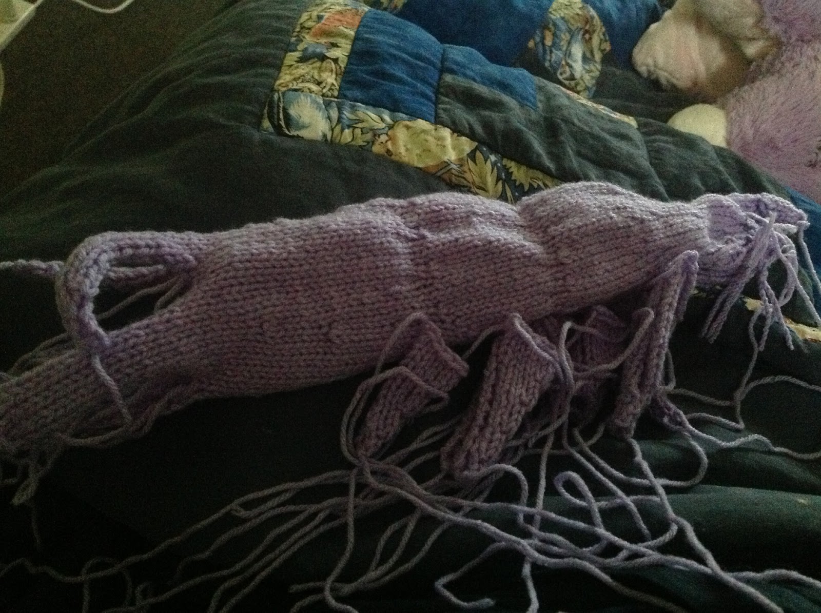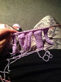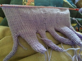 Stocking stitch the next 14 rows. Slide to the end of the needle and begin next fin