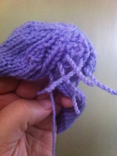 Take one length of yarn, approx 20cm in length. Twist with the twist if th yearn, causing it to start to twist upon itself. Holding both ends of the now twisted wool, and the centre of the yarn in the same fingers, smooth the twisted section into 2 tightly twisted coils. Tie at the end in your hand with the original ends and the centre to secure.