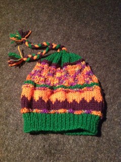 This hat was made for the gorgeous Camille. It has honeycomb cables, that seriously, if I had thought more about this, I would have realised that they are reversible. REVERSIBLE CABLES! Genius. I feel a scar coming on. And then I made them in a bright rainbow wool, so its kinda psychedelic.