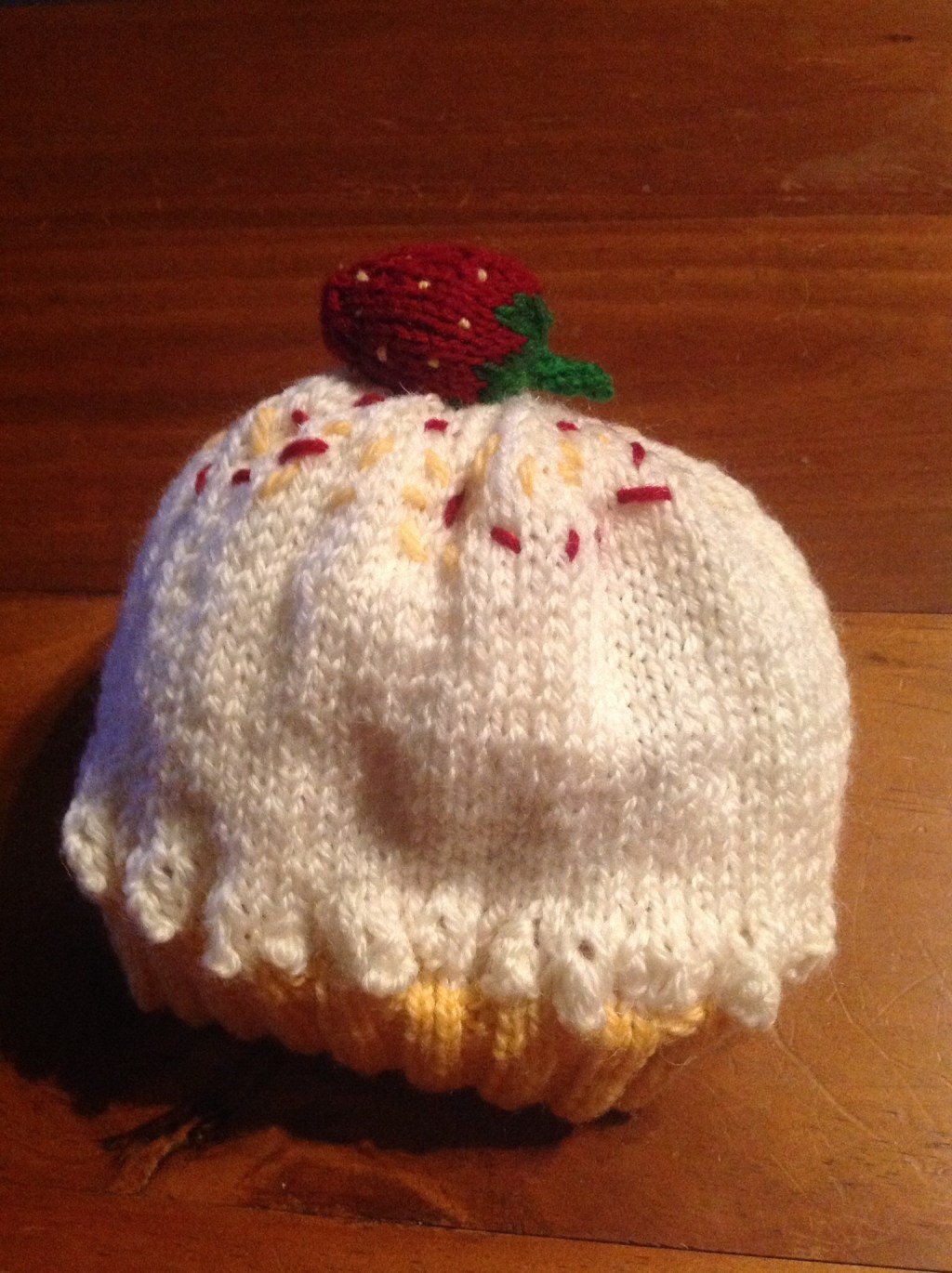 Followe these instructions to knit the strawberry. Stitch to top of hat.