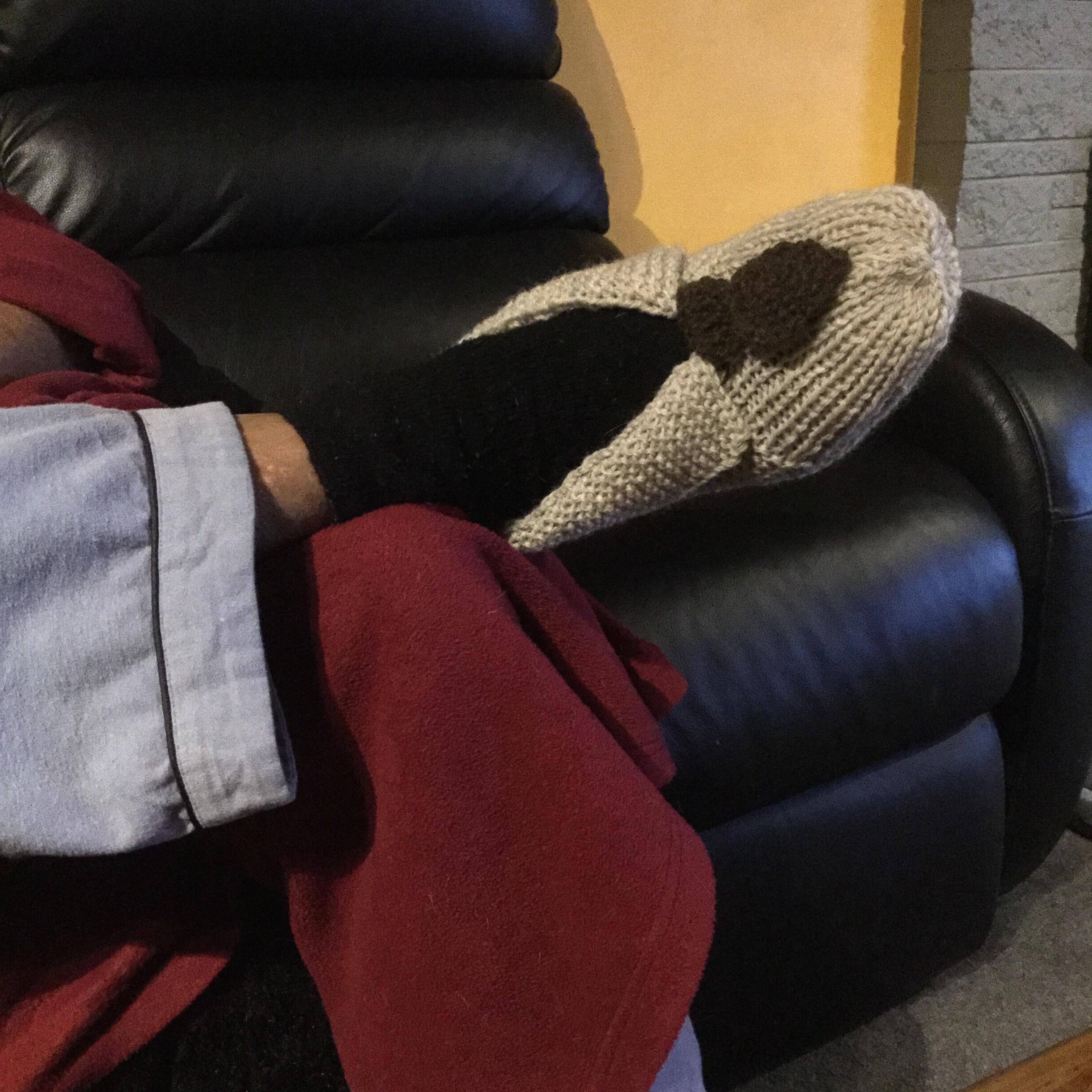 For those who follow for the knitting patterns, here is a link to a pretty darn awesome pattern…. if I do say so myself. It is the first slipper pattern that I have released, and will be part of an upcoming downloadable book of slipper designs. For now, it is on Instructables, and I would LOVE LOVE LOVE to win a weaving loom. If the option to vote for my instructable comes up, please do. You can vote with Facebook/twitter without being spammed or having to sign up for anything. Here they are, “Shirt and Tie” Slippers. The pattern comes in 4 sizes.