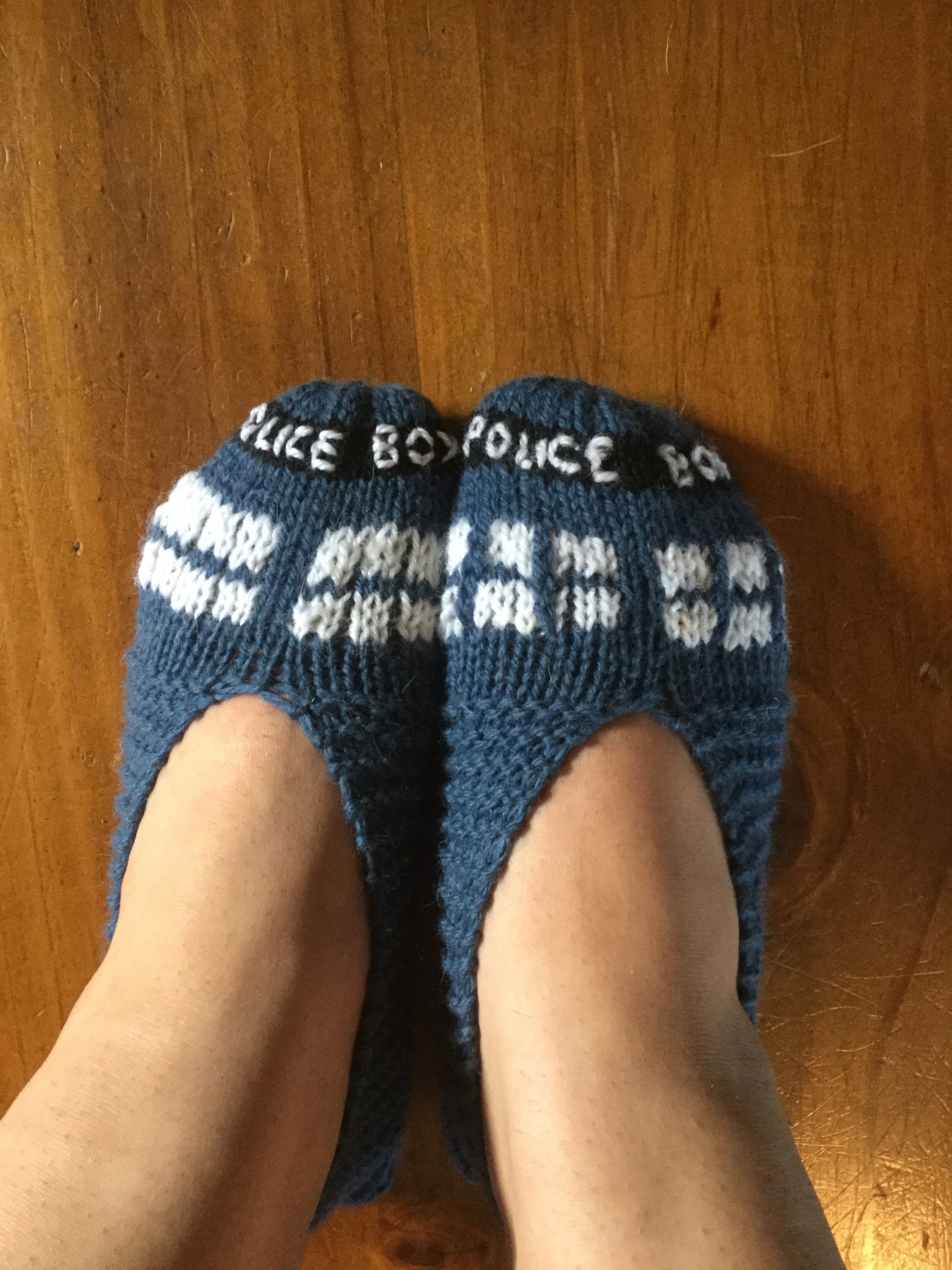 Also, this pair of Tardis slippers. I am in the process of preparing the pattern in written form. Then it will be published here as a free pattern. Later it may also appear in a booklet of Doctor Who inspired knits, but I think it is nice to throw them on here also.