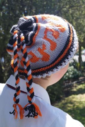 Stitch up the back of the hat, darn in the ends, and attach tassels or a pom-pom.