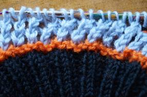 Rib 14 rows – use a knit 1, purl 1 rib for a tight band. Alternatively you can use a knit 2, purl 2 rib for a more relaxed fit.