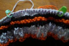 Cast on 100 in colour 1 (black) on 4mm circular needle. I like to use a 40cm needle, but you can use a size of your own preference. Once you have created your circle of knitting, place a stitch marker. This will be the very back of the hat – similar to the back seam of the straight needled version.