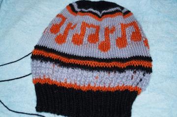 Wash the hat in a wool wash. Squeeze out most of the water with a towel. Block the hat until dry, or alternatively, hang the hat from the length of yarn left at the top until dry. This will even up the stitches with the musical notes.