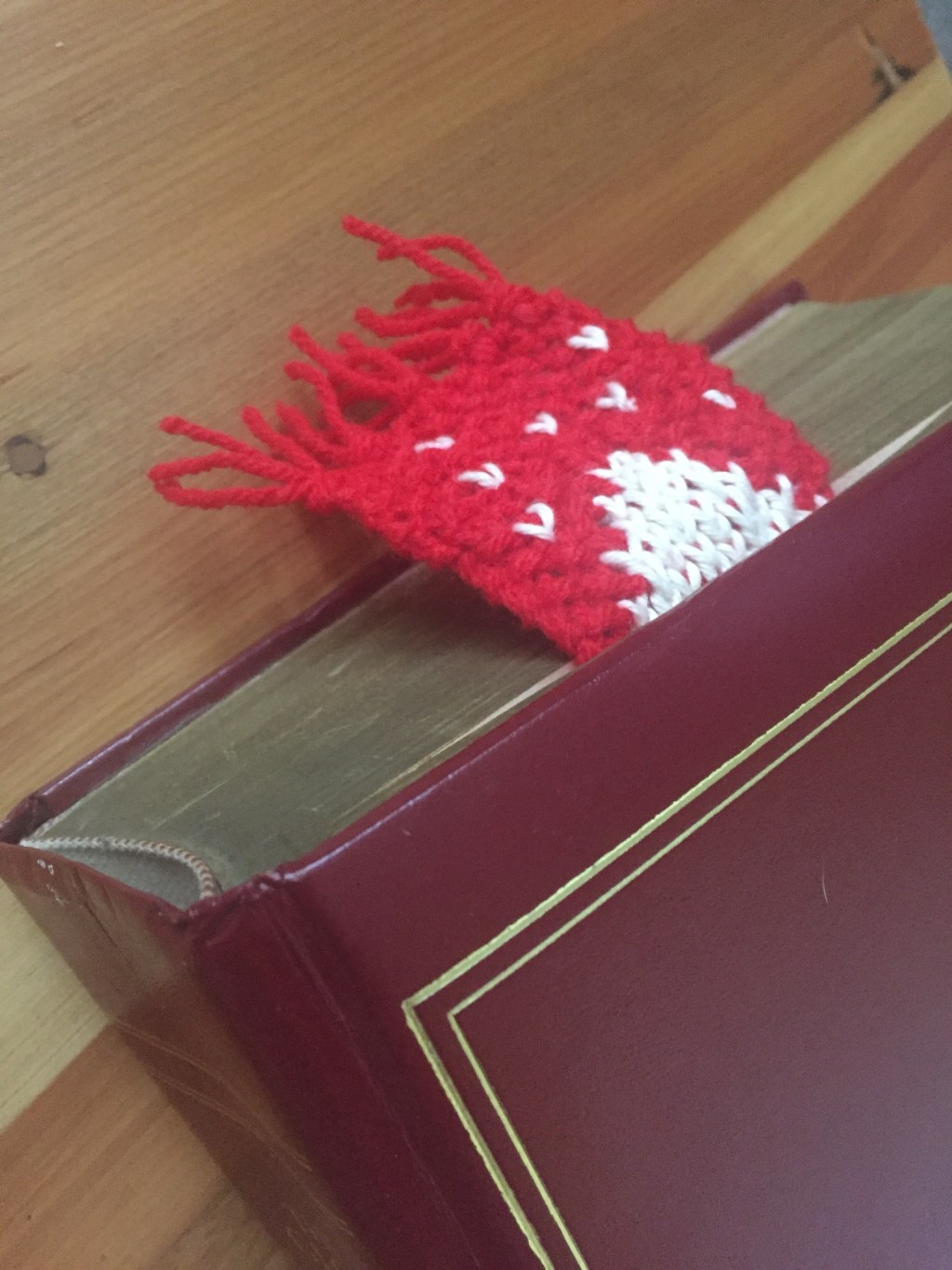 Welcome to Day 5. Today we are making a simple bookmark – perfect for stocking stuffers, or to add a personal touch to a book gift, or with a gift card. This is a somewhat Scandi style design (Expect more Scandi inspired knitting projects into the new year).