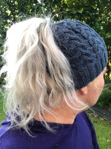 Any beanie pattern that knits from the band up to the top can be converted. As you knit up to the crown of the head, keep an eye on how many stitches are left. When you reach between 10-16 stitches, cease the regular pattern. Knit 1, Purl 1 rib over 3-4 rows or rotations at this point. Instead of casting off, thread a length of elastic through the stitches and tie in a knot. I use a flat elastic that is about 3mm wide as my hair can be heavy. This now has a hat with a pony tail hole. The elastic is the key to a removable pom-pom.