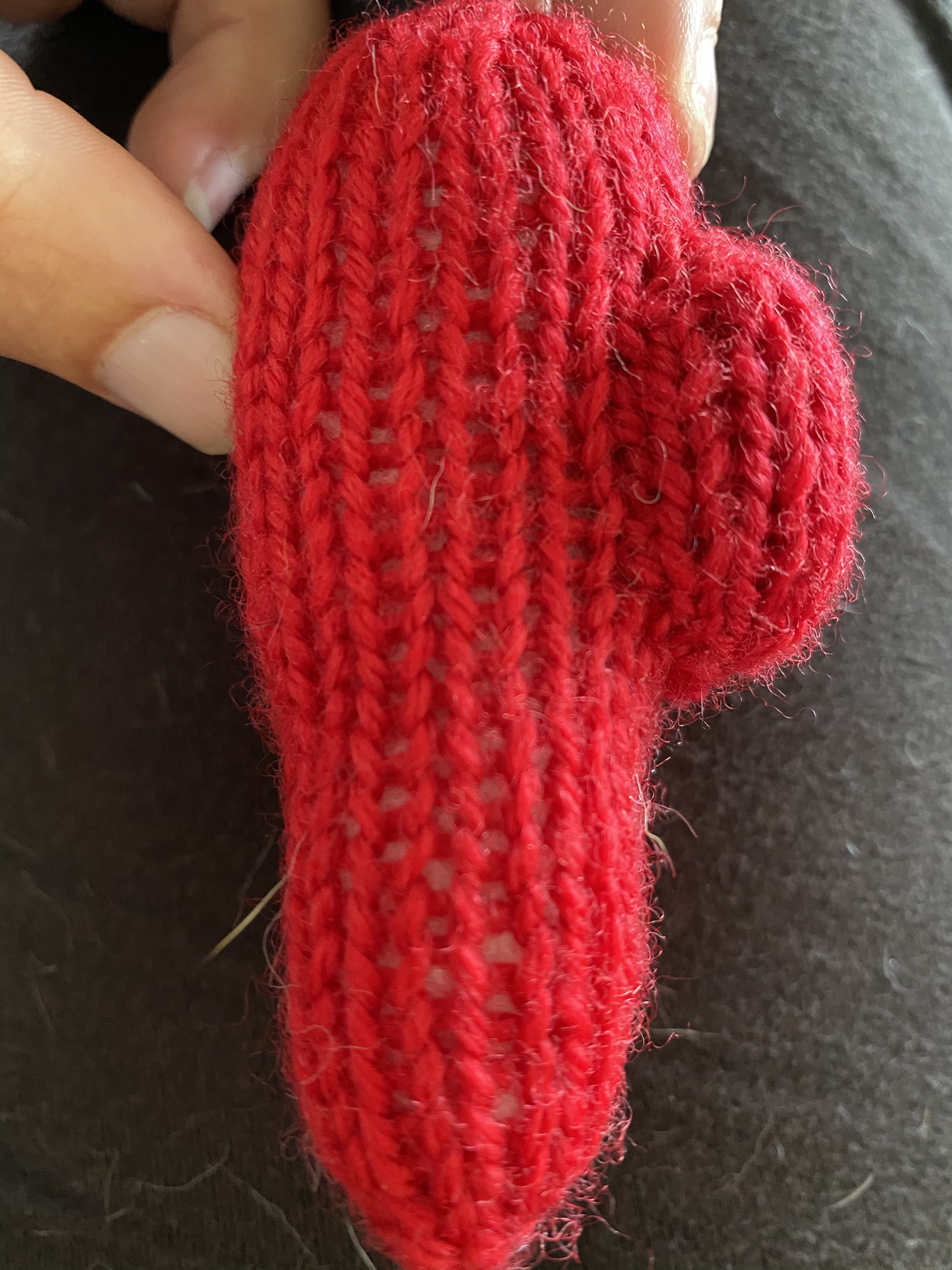 Stockinette stitch 8 rows. Cut yarn with a long-ish yarn tail, and slide this leg to the far end of the needle.