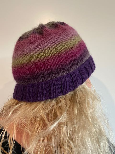 - You can change out the colour of the yarn as often as you like. For the second one I made, I used the remainder of 2 balls of yarn from other projects that I couldn’t bear to part with as they were super soft. So this was made with a purple yarn for the ribbed section, and a variegated yarn for the main section. You could just randomly change colours – maybe try joining your leftover yarn together with Russian joins and knitting a scrappy hat. You could also change yarn colour over the 40 (50) rows every 5 or 10 rows to create stripes.