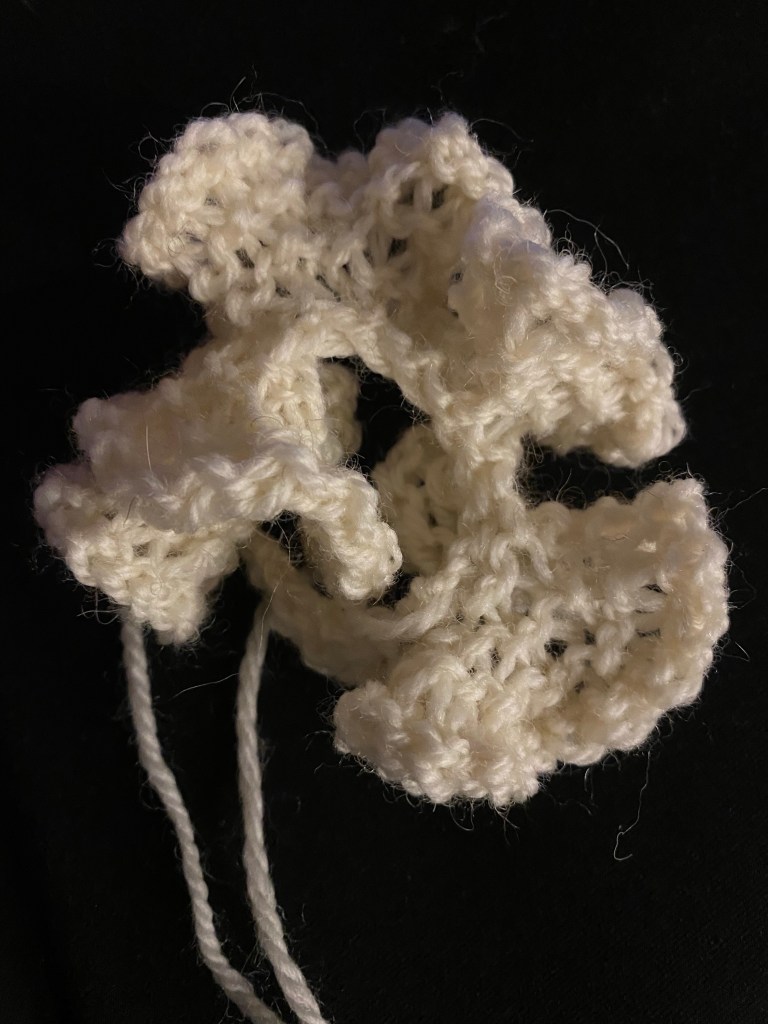Roll the knitting from one end to the other into a circle. Secure with a few stitches. Stitch on a purple ribbon and pinback.