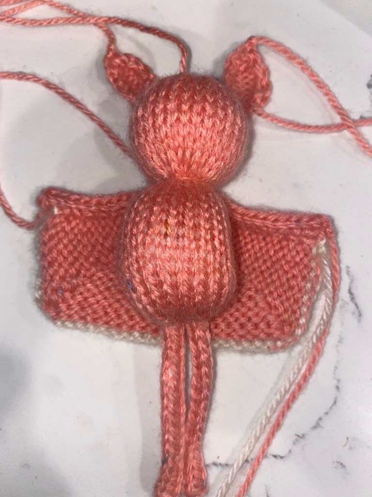 Fold the legs in half. Stick the folded piece in the bottom opening. Thread the yarn tail through the cast on edge, and pull tight around the legs. Stitch the legs to the body firmly as you close up the bottom opening.
