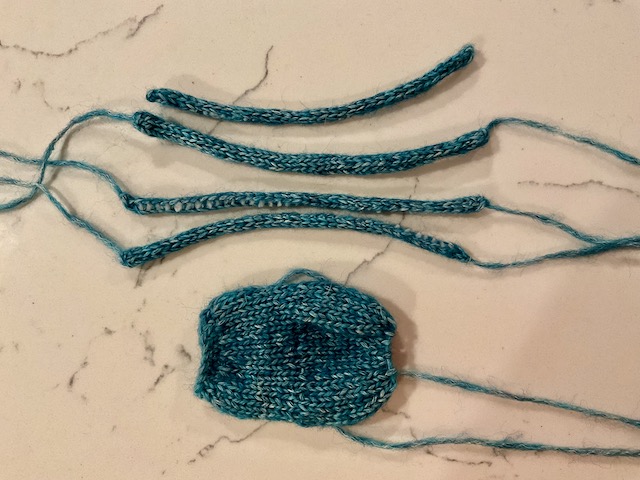Special terms and words: knitting and purling used. Stockinette is just alternating rows of Knit and Purl (with the purl being on the inside mostly). Icord used – which is essentially 3 stitches on double pointed needles where instead of turning your work, you slide the work to the other end of the needle and continue knitting. I will make video tutorials if needed.