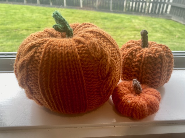 Always the go for the season. These can also be knit into Jack-o-Lanterns with just a few triangles stitched on. There is also a lemon if you want to add fruit to the arrangement…..