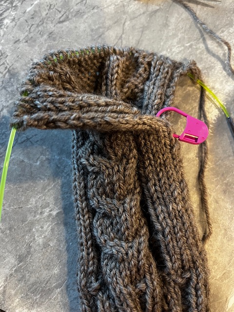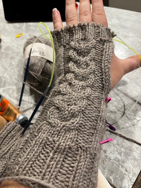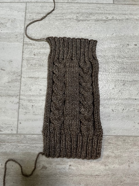 At this point we will be knitting back and forth, so use the following cable row pattern for this section. This creates the thumb hole.