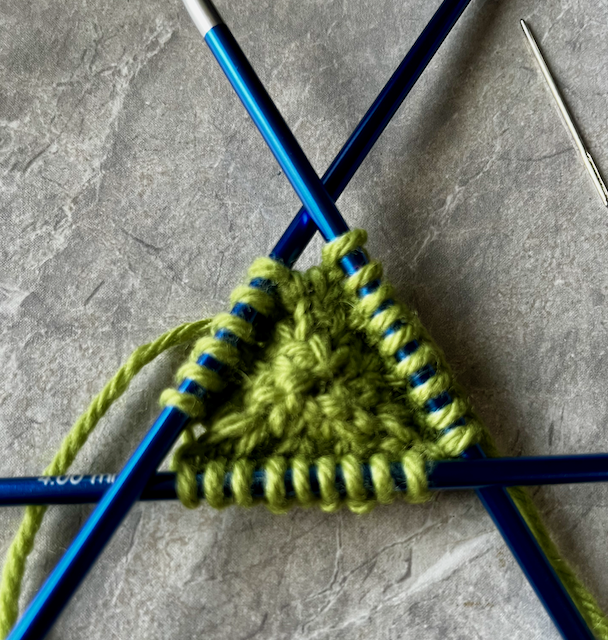 Row 30: Change to green yarn. Knit 2 together – repeat over the whole row (2 stitches on each needle – 6 in total)