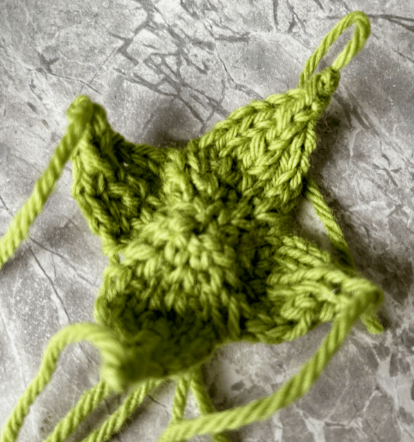 Trim off the red yarn with a tail remaining. You can tie this to the green yarn tail at the start to secure them both.