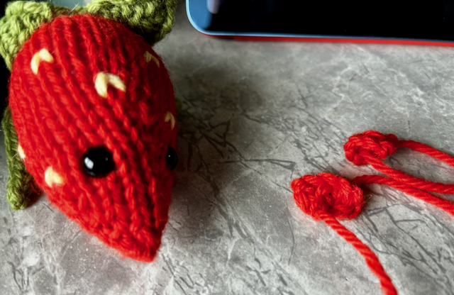 I saw a crocheted strawberry mouse…. and next thing you know, I am working on a strawberry knitted mouse pattern. This pattern can also be found here on Ribblr for a nominal fee if you prefer the interactive PDF format they use.