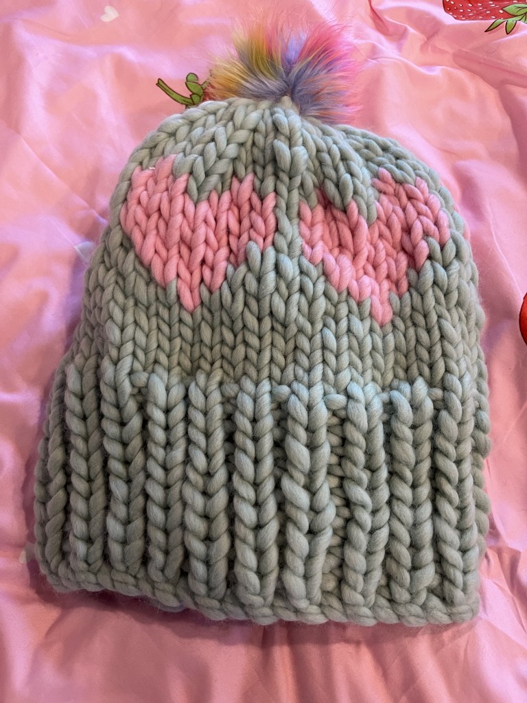 A few years ago I posted about a chunky knit beanie that I called the 1 Hour Beanie…. as it flew by knitting it. This is a Valentines Version of the same hat.