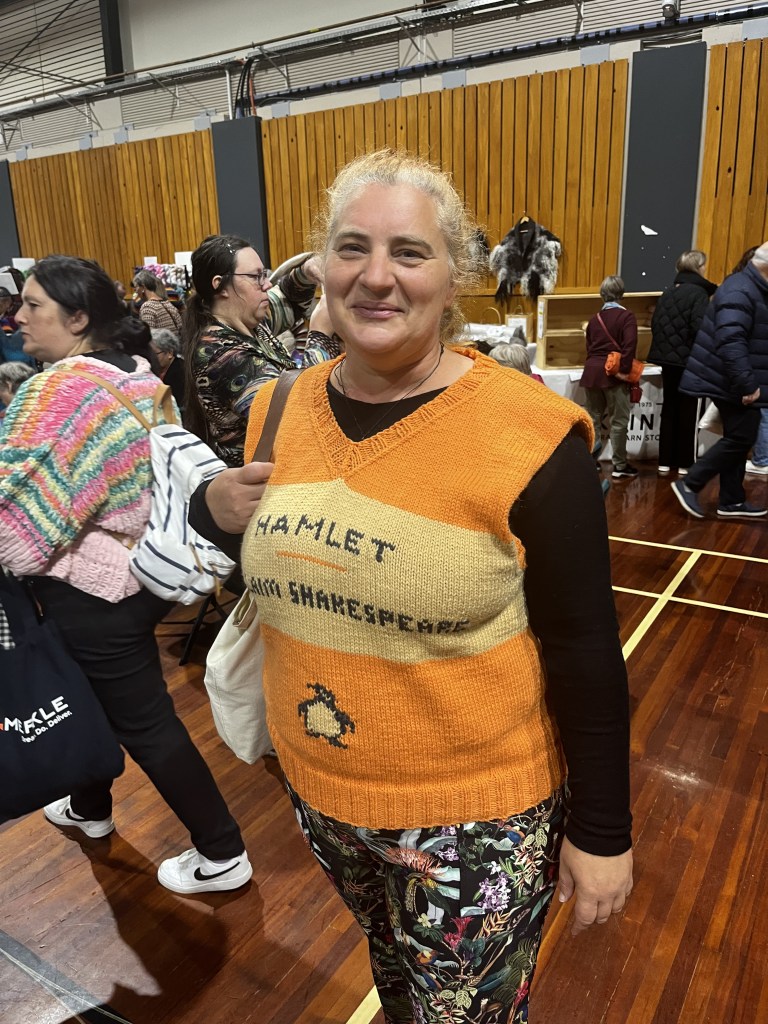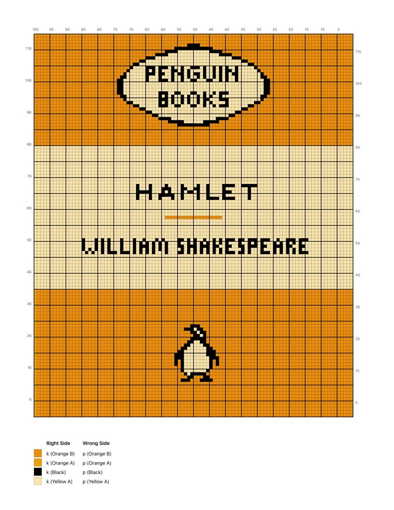 I made this Bookvest based on the cover of the Penguin Classics – for one of my favourite works, “Hamlet”. It was a total hit when wearing it at a yarn event, and a book event.