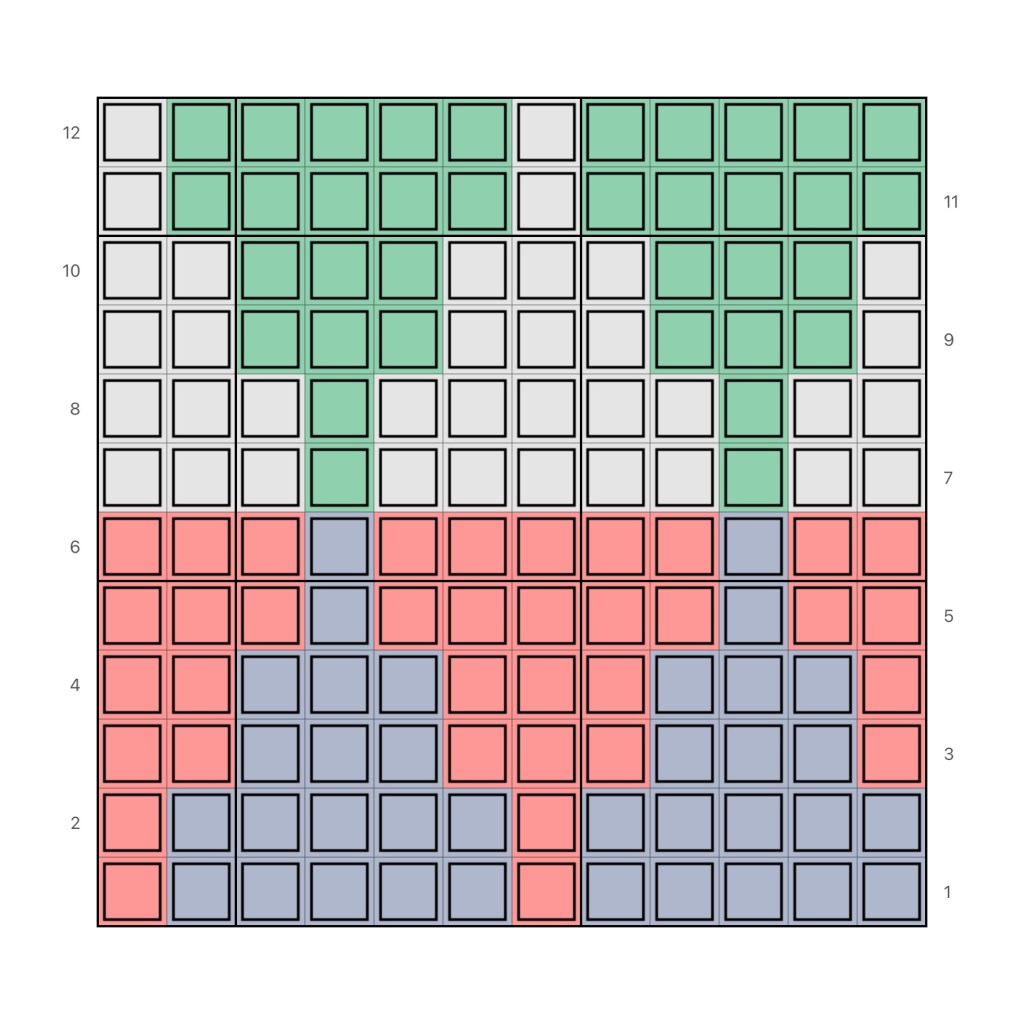 Large: Complete the rows of the chart 3 1/2 times. This will give you 4 grey/pink rows and 3 green/white rows (or whatever colours you have chosen)