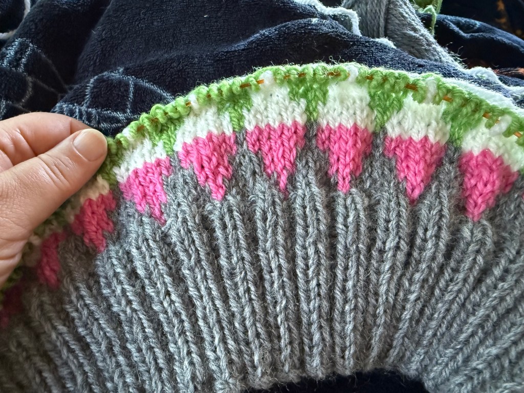 Stockinette 2 rows in the colour of your band.