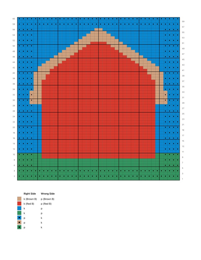 Follow the chart to create the barn. There are 40 stitches and 60 rows in total. You can carry your floats, but I recommend having separate balls of yarn for each section and wrapping them as you change colour.